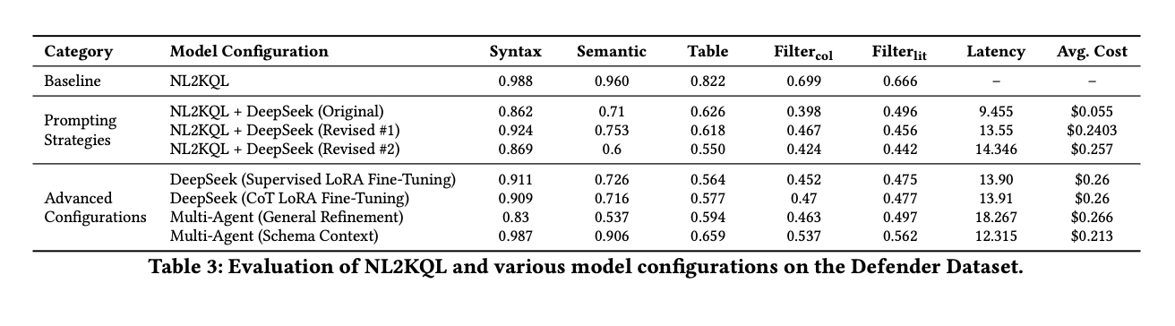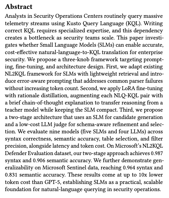 - Results show high accuracy on Microsoft’s NL2KQL Defender dataset and generalization to Microsoft Sentinel, with up to 10× lower token cost than GPT-5 (as reported in the paper).